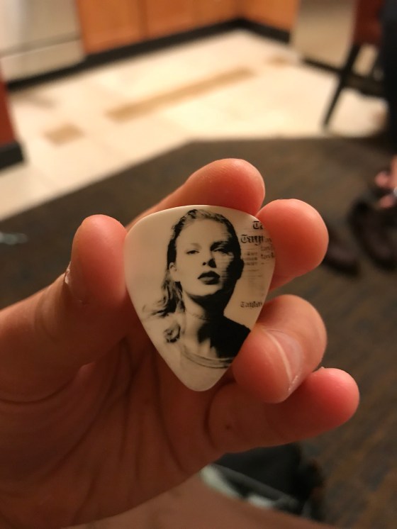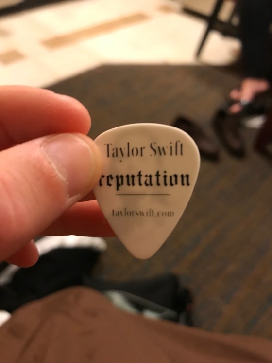 During a random song, I think was during Gorgeous or Love Story or something, a person walked past my cousin and I and we were both dancing and going so hard. A person walked past us and held his hand out and all the sudden, I notice that it was PAPA SWIFT. IT WAS HIM AND I WAS FREAKING OUT. He handed my cousin and I guitar picks and I was like “This tour, I’m meeting Papa Swift and getting picks from him this tour.” AND IT ACTUALLY HAPPENED. I literally shoved the pick into my bag before I lost it and was freaking out the whole time. He wore a cute little yellow rain coat as he was walking down the isle where a bunch of other people were walking and other people barely noticed him. My cousin was confused but I was like “THATS PAPA SWIFT. HE JUST GAVE US PICKS. OH MY GOD!”
